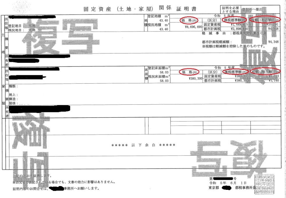 Q 固定資産税・都市計画税の質問です。 固定資産(土地・家屋)関係証明書 詳しい情報については消してます。 東京23区の不動産です。 この物件の固定資産税・都市計画税を知りたいです。