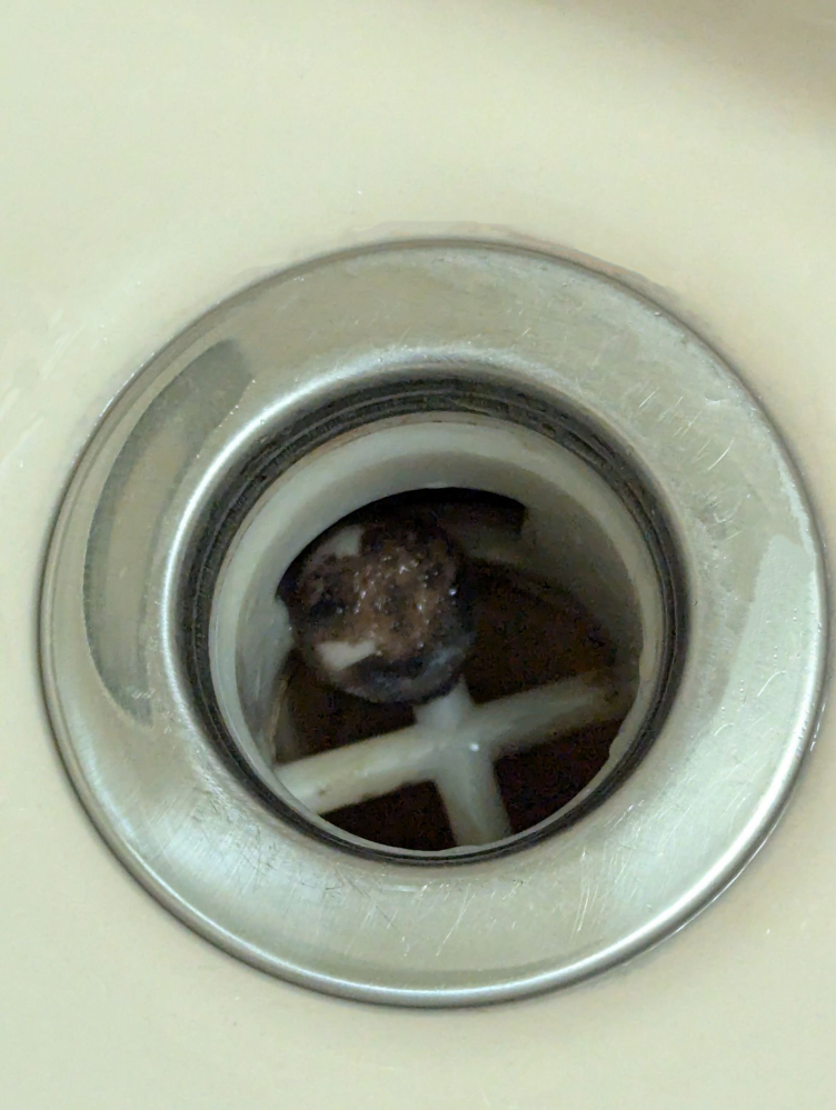 いずれにせよ洗面台には使われていない物で、たまたまその横穴(オーバーフロー穴)に入り込んで、長期間引っかかっていたのだと推測出来ます。