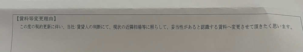 「この度の契約更新に伴い、当社:賃貸人の判断にて、現状の近隣相場等に照らして、妥当性があると認識する賃料へ変更させて頂きたく思います。」