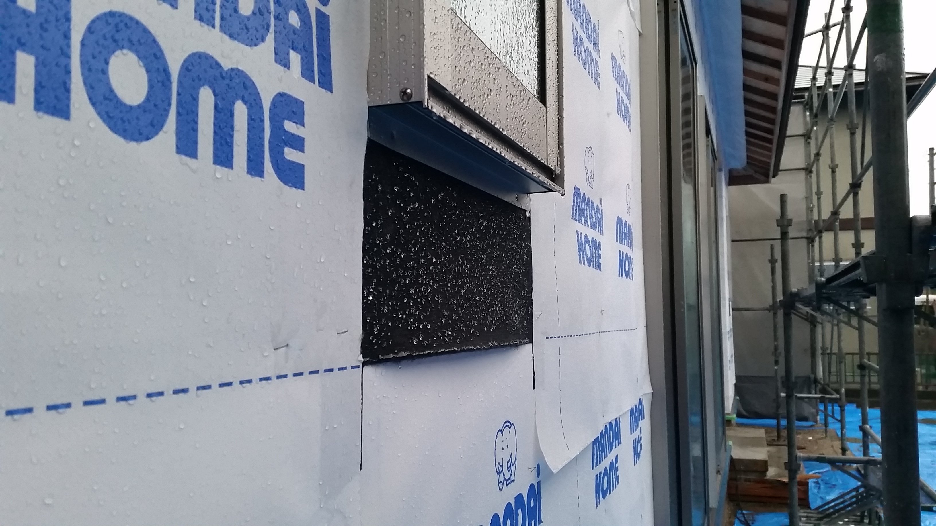 サッシの下部には、サッシを取り付ける前にこのシートを差し込んで下に垂らしておくことで、サッシから雨漏りしにくくなります。