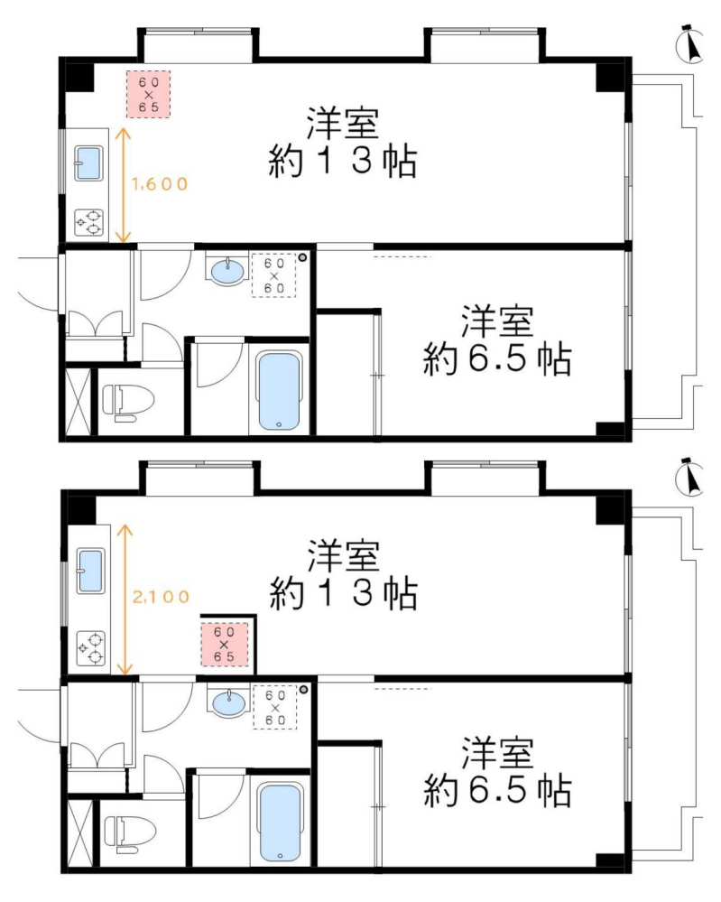 下)キッチン2,100mm(回り込んで入室しなくてはいけない。圧迫感が出る。私はこちら派)