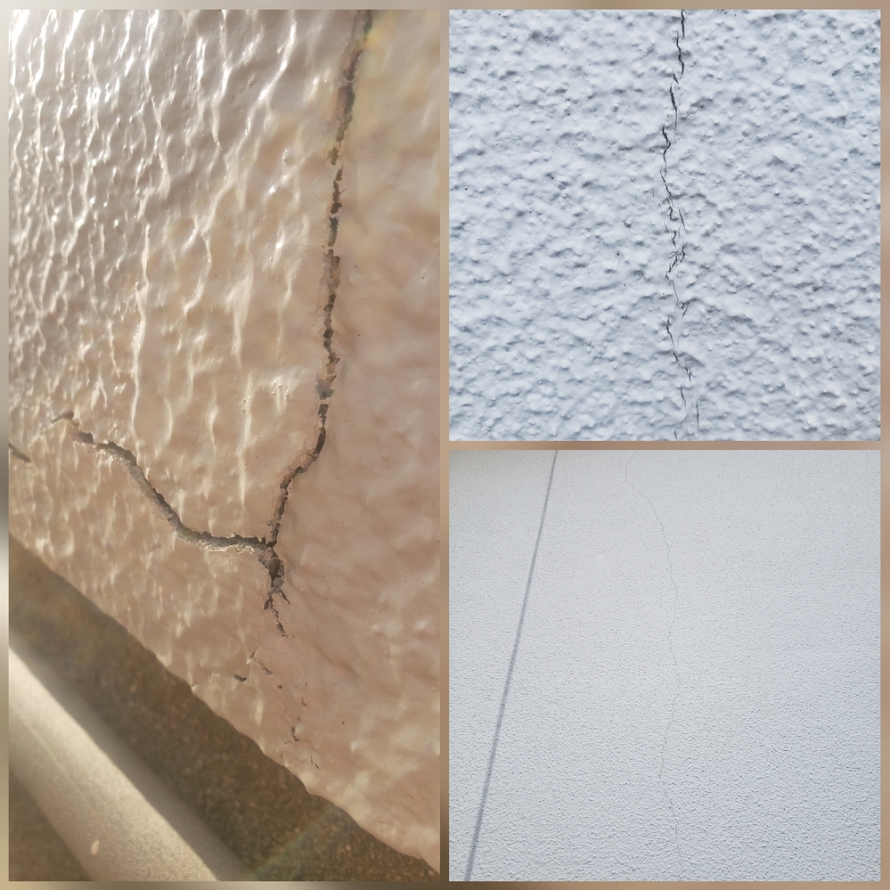 が同じ場所で外壁の下から上まですべてに亀裂が入っています。 左はサッシの下から外壁の下まで入っています。 画像は一番下の所で上は右の様な亀裂です。