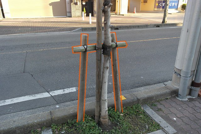 街路樹でさえ 浅いので ずっと長期間 支柱で支えていますね